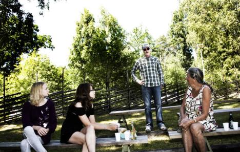 Jan Harpo Svensson inspekterar scenen och dess omgivningar på Hallandsgården, där han ska uppträda i morgon onsdag. Emma Persson, till vänster, Sara Kullström och Berit Eriksson är turister från Stockholm. Fotograf: Emma Gustafsson